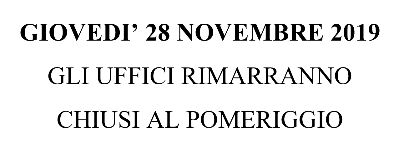 Si comunica che giovedì 28 novembre 2019 gli uffici rimarranno chiusi al pomeriggio