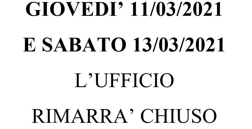 Si comunica che giovedì 11/03/2021 e sabato 13/03/2021 l'ufficio rimarrà chiuso