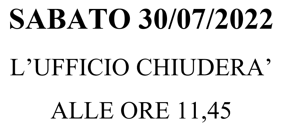 Si avvisa che sabato 30/07/2022 l'ufficio chiuderà alla ore 11,45